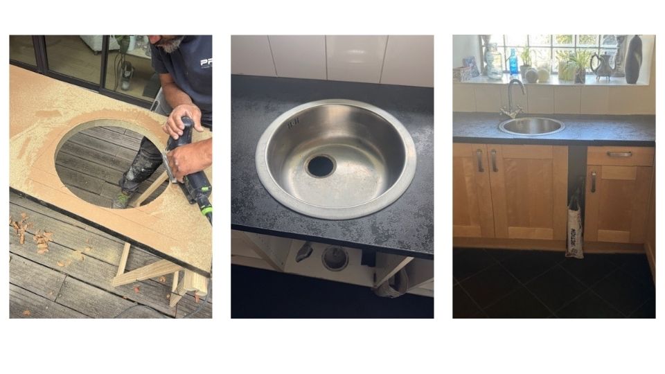 Pour installer une nouvelle vasque parfaitement adaptée, l’ouvrier a d’abord dessiné la forme arrondie directement sur le plan de travail.
